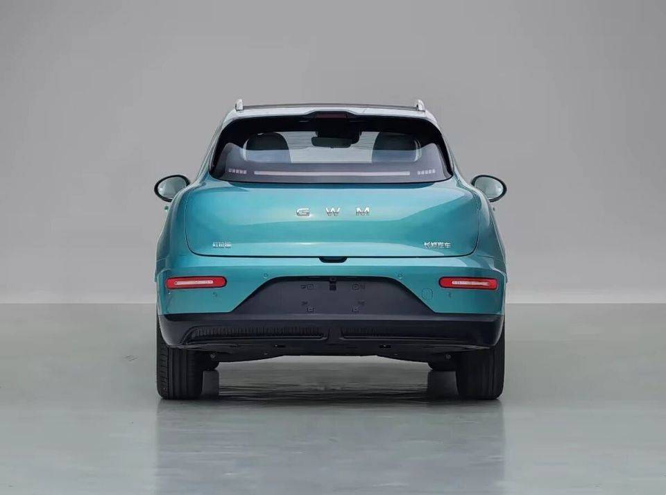 车身尾部,延续了欧拉家族的尾部造型,尾部顶部配备高绕流板,尾窗的倾斜度是比较大,并且尾部是比较圆润,后包围也是使用大量黑色搪塑材料。