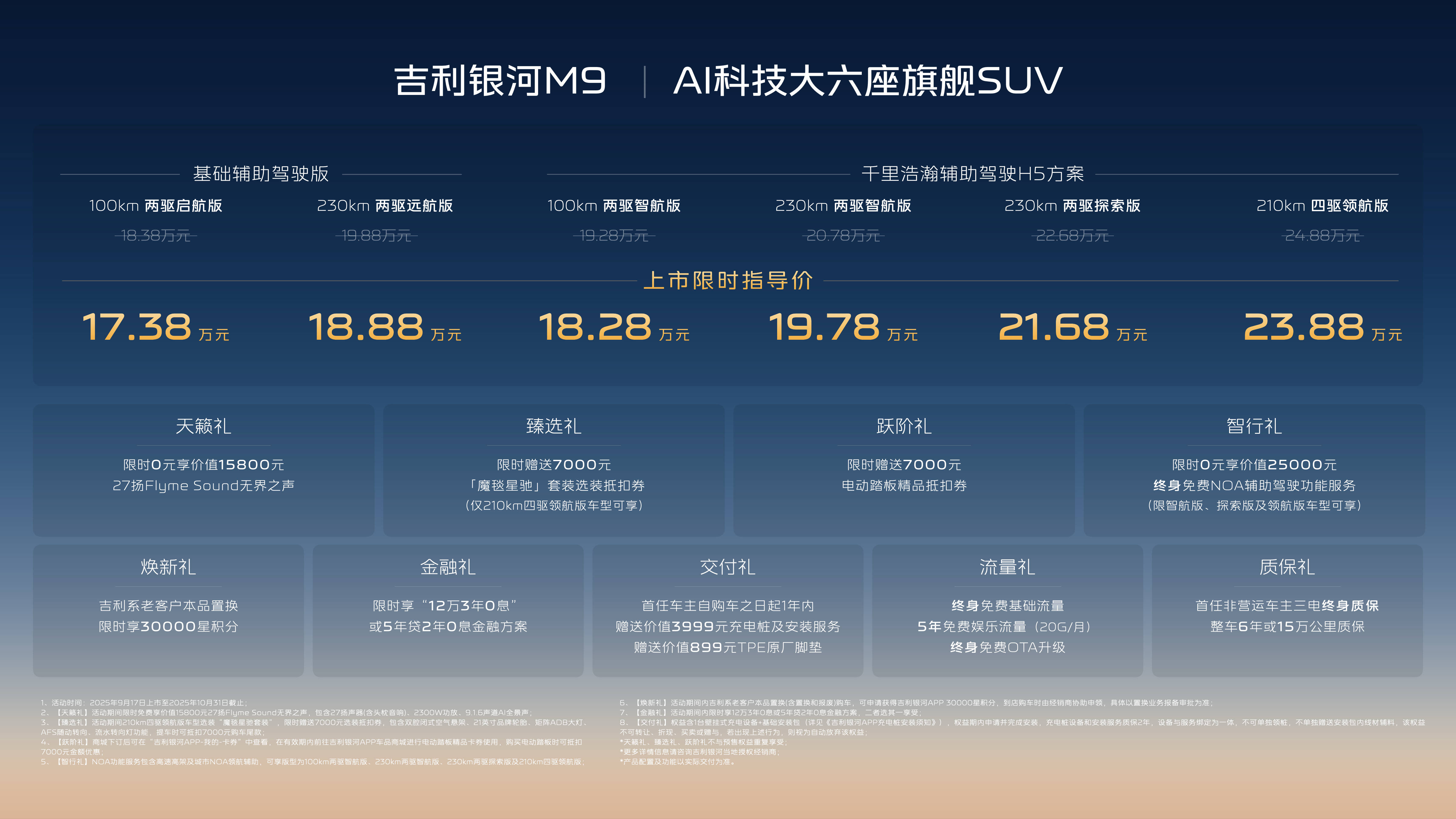 吉利银河m9上市价格相比预售价降了2万元,起步17.38万,顶配23.88万,媒体们都在喊“爆款又来了”。